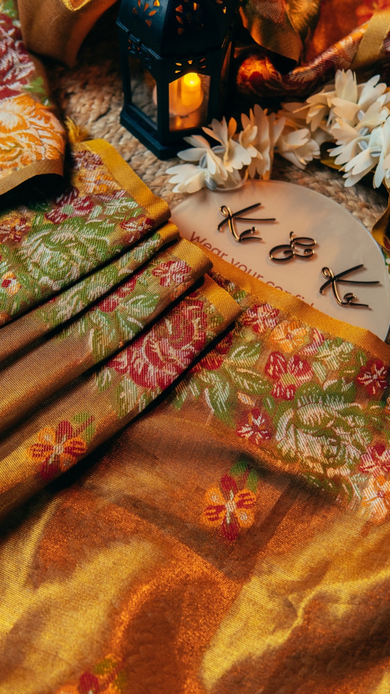 A luxurious and lightweight traditional saree crafted from premium Tussar Tissue Silk, giving it a beautiful metallic sheen and elegant drape. This saree features exquisite, intricate floral weaving work throughout the body and a contrasting border/pallu. This sophisticated, glamorous piece is an ideal choice for formal parties, wedding functions, and festive celebrations.